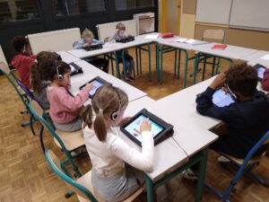 L’école possède 15 iPad. Chaque semaine, les élèves de CP utilisent l’application 1000 mots. Les activités proposées viennent compléter les exercices de phonologie et de combinatoire de leur fichier de lecture.